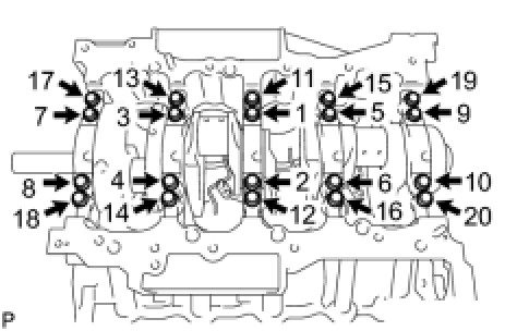(b) Uniformly loosen the 20 bearing cap bolts in several steps, in the sequence shown in the illustration.