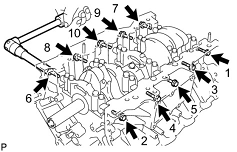 (a) Uniformly loosen and remove the 10 bearing cap bolts and 10 seal washers in several steps, in the sequence shown the illustration.