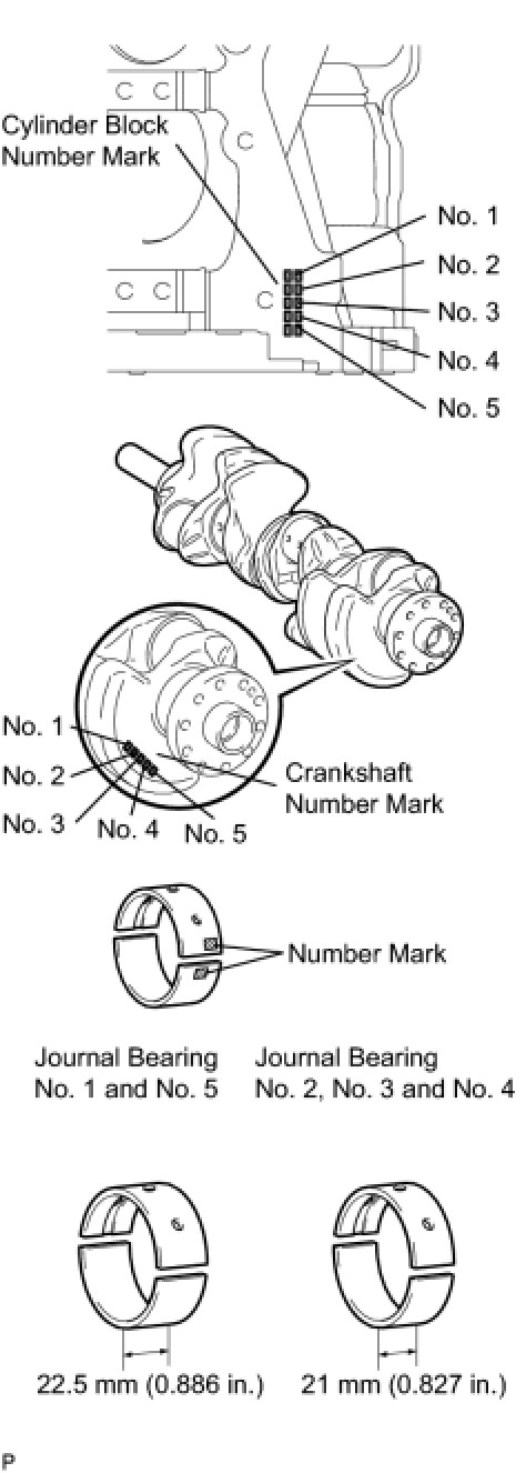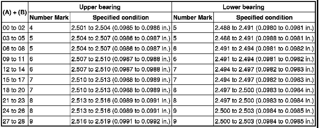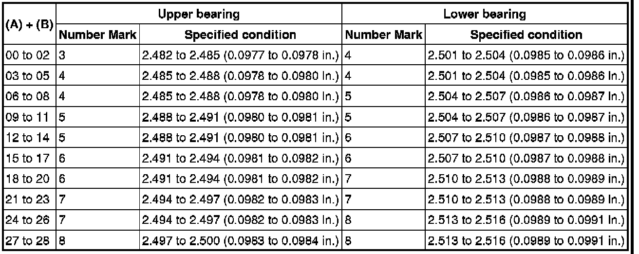 If replacing a bearing, replace it with one having the same number. If the number of the bearing cannot be determined, select the correct bearing by adding together the numbers imprinted on the cylinder block and crankshaft. Refer to the table below for the appropriate bearing number. There are 6 sizes of standard bearings. For No. 1 and No. 5 position bearings, use bearings marked 4, 5, 6, 7, 8 and 9. For other position bearings, use bearing marked 3, 4, 5, 6, 7 and 8.