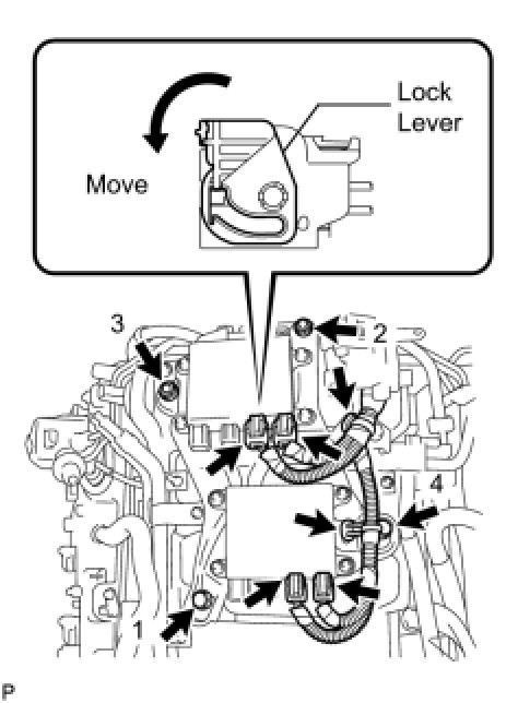 (b) Connect the 4 wire harness connectors to the injector driver. Then move the lock lever as shown in the illustration to lock the connectors.
