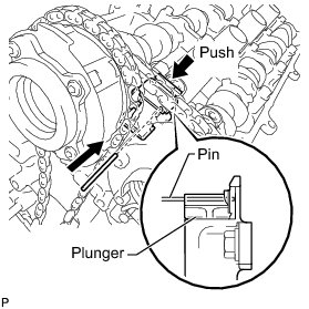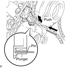 (a) While pushing down the No. 3 chain tensioner, insert a pin of dia1.0 mm (0.039 in.) into the hole to fix it in place.