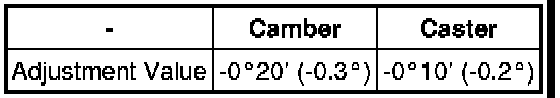 If the caster and steering axis inclinations are not within the specified values, after the camber has been correctly adjusted, recheck the suspension parts for damaged and/or worn out parts.