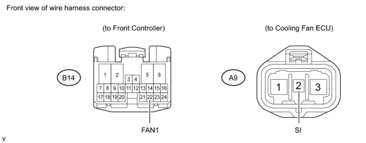 (c) Check the resistance of the wire harness between the front controller B14-22 (FAN1) and cooling fan ECU A9-2 (SI).