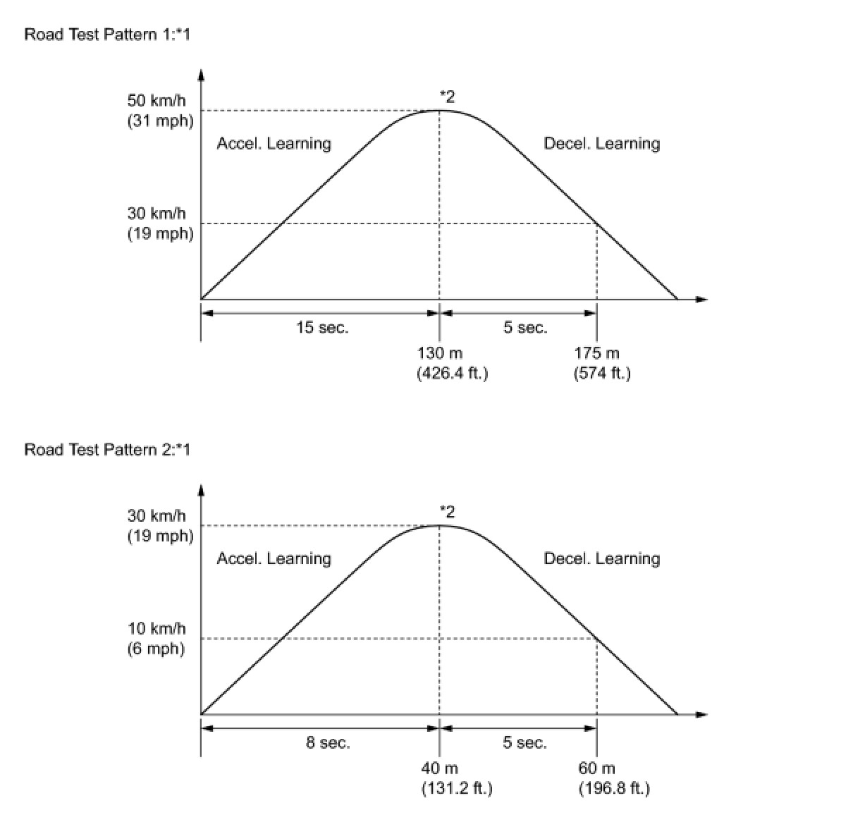 * *1: After gradually accelerating over a distance of approximately 130 m (426.4 ft.) for a period of approximately 15 seconds, gradually decelerate over a distance of approximately 45 m (147.6 ft.) for a period of approximately 5 seconds.