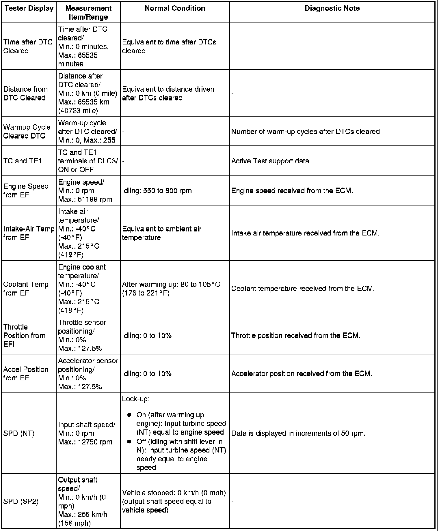 Using the Techstream to read the Data List allows the values or states of switches, sensors, actuators and other items to be read without removing any parts. This non-intrusive inspection can be very useful because intermittent conditions or signals may be discovered before parts or wiring is disturbed. Reading the Data List information early in troubleshooting is one way to save diagnostic time.