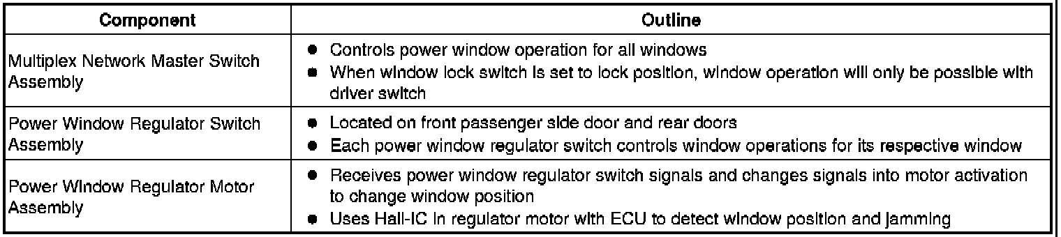 * The power window control system controls the power window UP/DOWN function using the power window regulator motors. The main controls of this system are the multiplex network master switch which is built into the driver side door, and the power window regulator switches which are built into the front passenger side door and rear doors.
