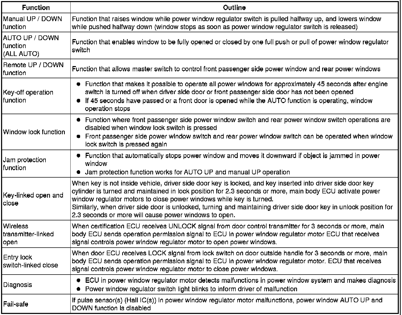 The power window control system has the following functions: