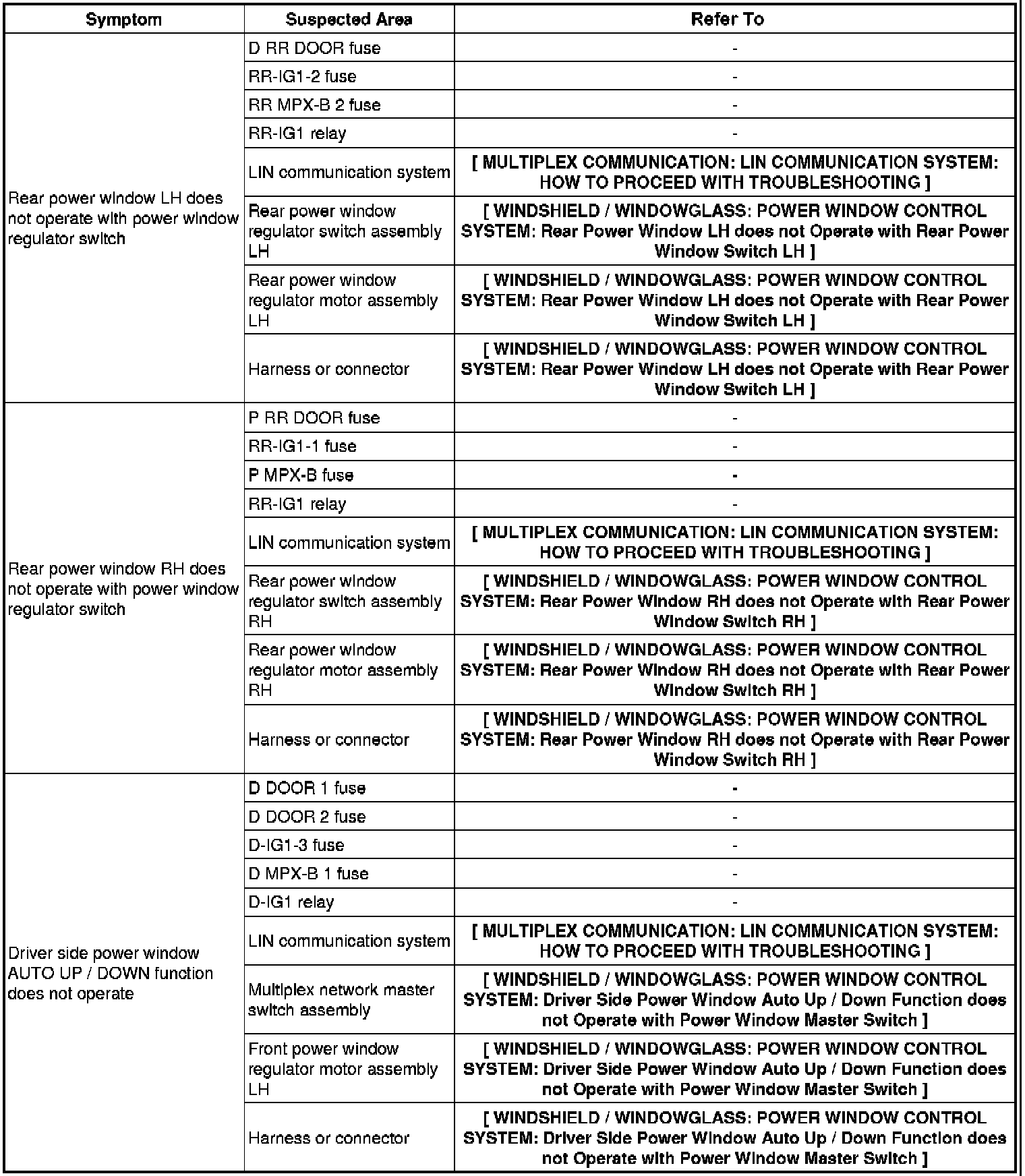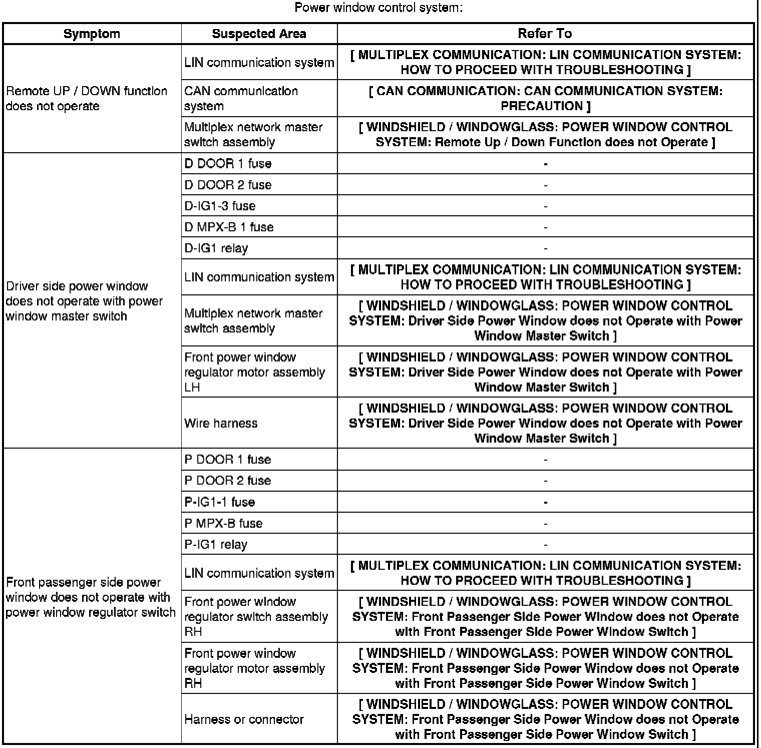 WINDSHIELD / WINDOW GLASS: POWER WINDOW CONTROL SYSTEM: PROBLEM SYMPTOMS TABLE