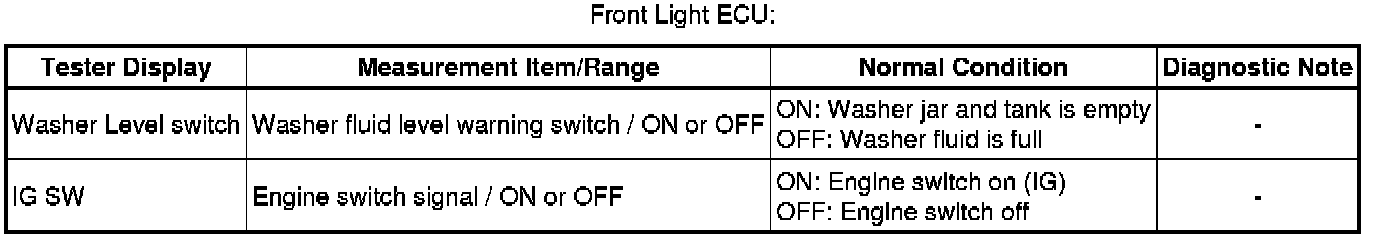 When a BODY (front light ECU) related vehicle switch is ON, Active Test items related to the vehicle switch are prohibited (double operation prohibition). Check that the vehicle switches are OFF before performing Active Tests.