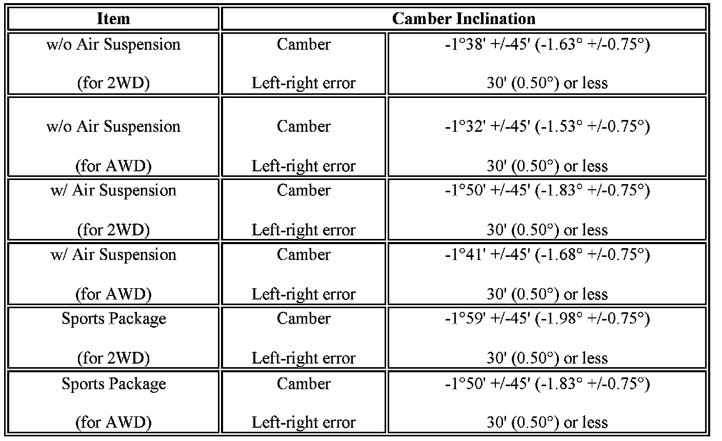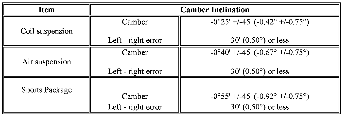 - The maximum tolerance of right and left difference for the camber is 30' or less.
