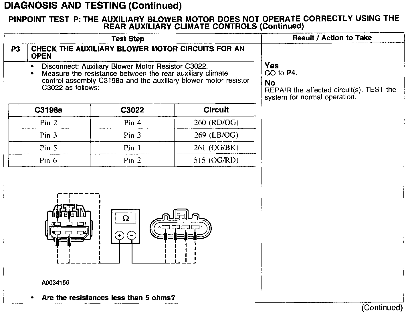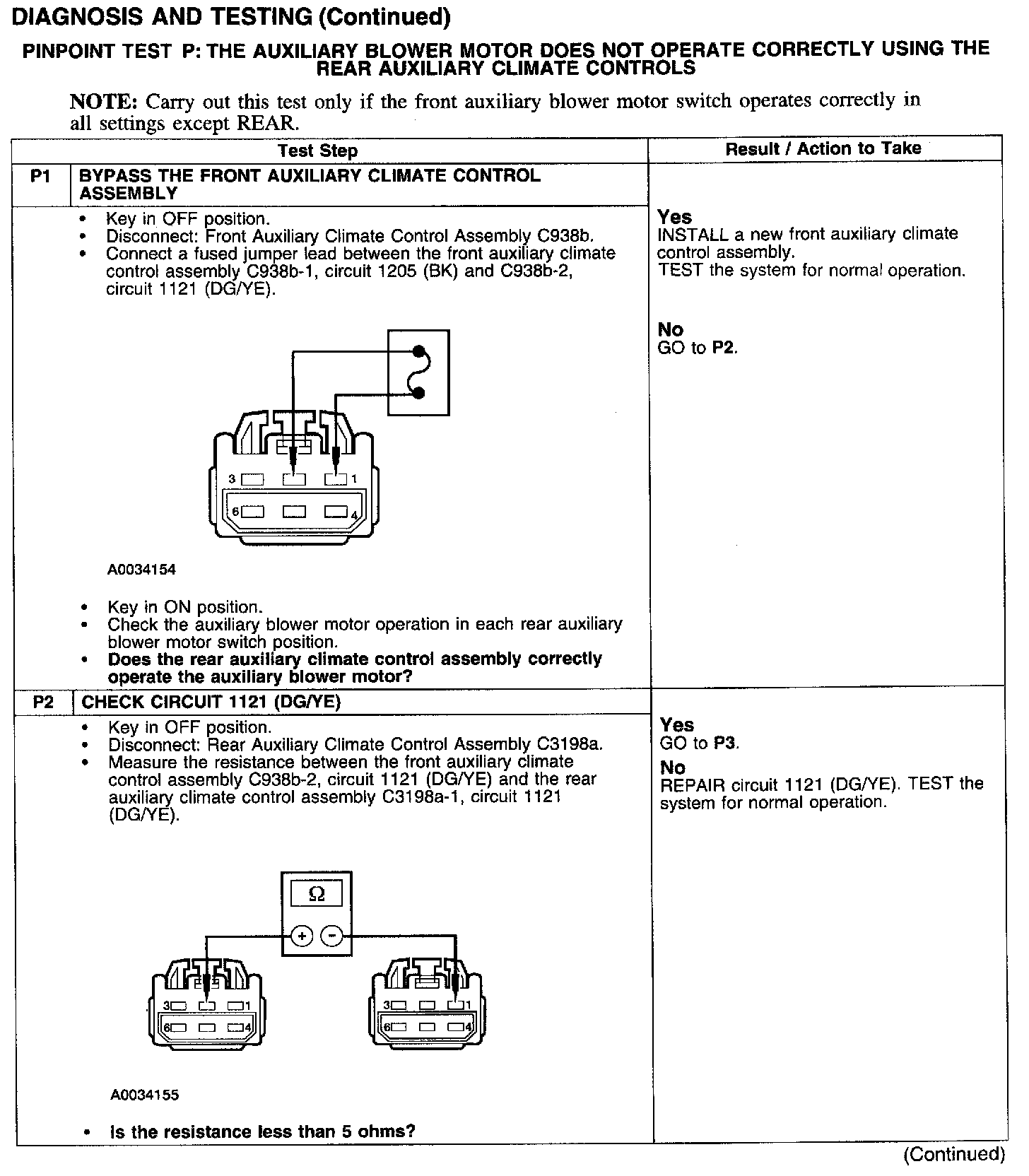 PINPOINT TEST P: THE AUXILIARY BLOWER MOTOR DOES NOT OPERATE CORRECTLY USING THE REAR AUXILIARY CLIMATE CONTROLSTest P1-P2: