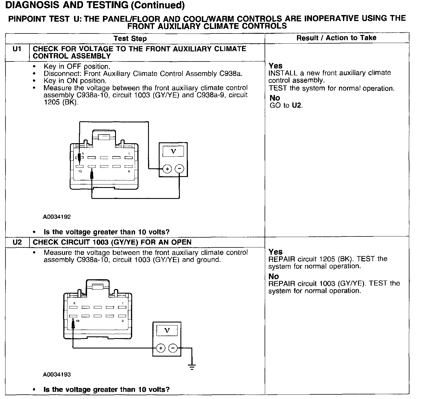 PINPOINT TEST U: THE PANEL/FLOOR AND COOL/WARM CONTROLS ARE INOPERATIVE USING THE FRONT AUXILIARY CLIMATE CONTROLSTest U1-U2: