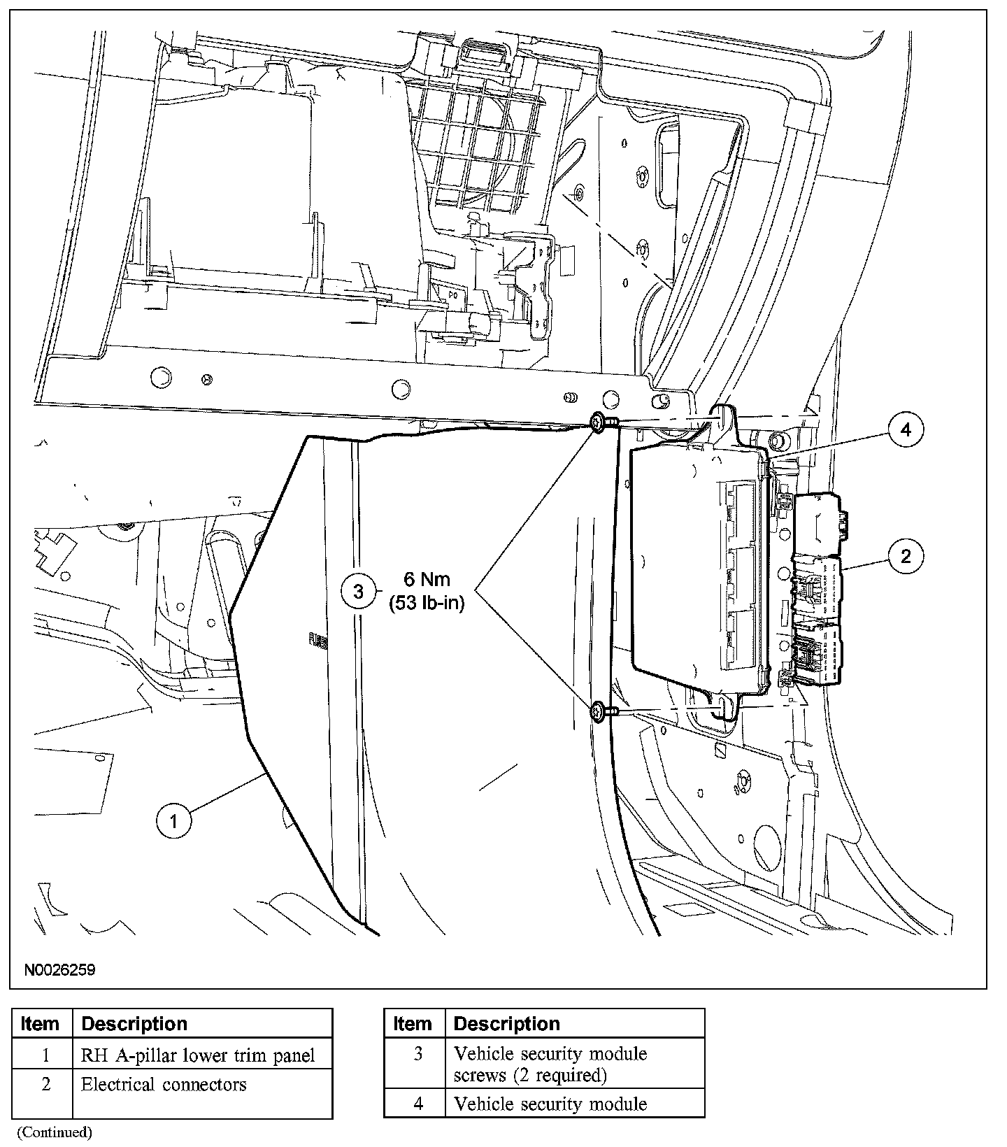 CAUTION: The steps included in the vehicle security module removal and installation procedure are critical to restoring the vehicle security and tire pressure monitoring systems to normal operation. A new vehicle security module is delivered in manufacturing mode with 6 pre-set diagnostic trouble codes (DTCs) related to the tire pressure monitoring system (TPMS). The presence of these DTCs requires the installation procedures be followed in order to clear the DTCs and enable normal vehicle security module operations.