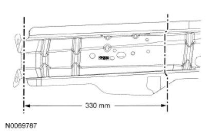 Scribe a cut-line 330 mm (12.99 in) from the front bumper bracket on the outer frame rail. Using a plasma cutter, cut-off wheel or reciprocating saw, cut off the front rail inner and outer assemblies along the scribe line.
