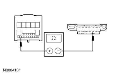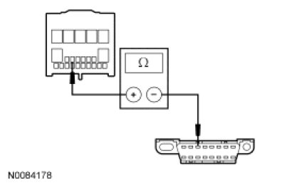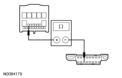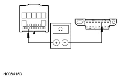 - Measure the resistance between the RFA module C2153d-21, circuit VDB04 (WH/BU), harness side and the DLC C251-6, circuit VDB04 (WH/BU), harness side.