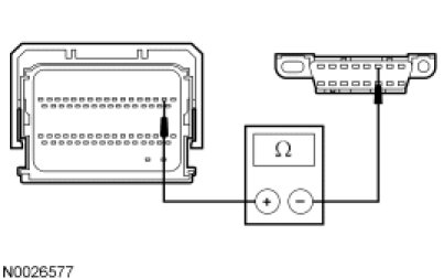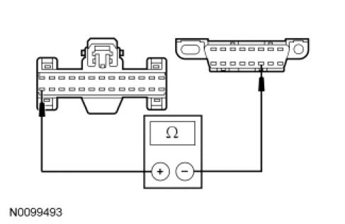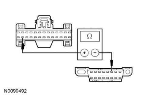 - Measure the resistance between the IPC C220-25, circuit VDB04 (WH/BU), harness side and the DLC C251-6, circuit VDB04 (WH/BU), harness side.