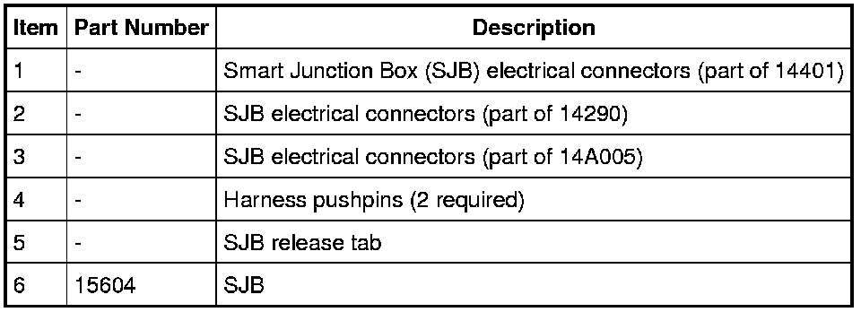 NOTE: The steps included in the SJB removal and installation procedure are critical to restoring the vehicle security and the TPMS to normal operation. A new SJB is delivered in a manufacturing mode with 8 pre-set DTCs related to the TPMS. To clear the 8 DTCs, successful configuration of the SJB must occur, followed by successful TPMS sensor training, and a successful self-test, including clearing of the DTCs. The 8 DTCs are as follows: