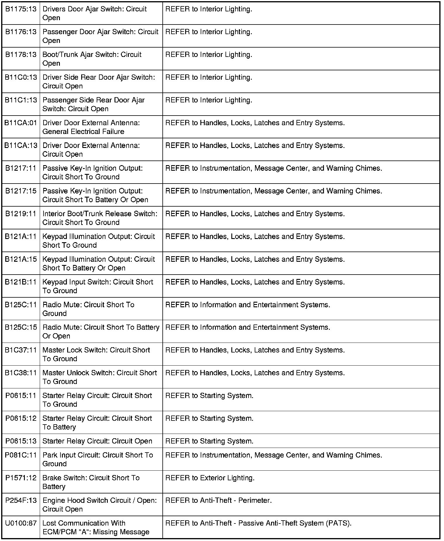Remote Function Actuator (RFA) Module DTC Chart