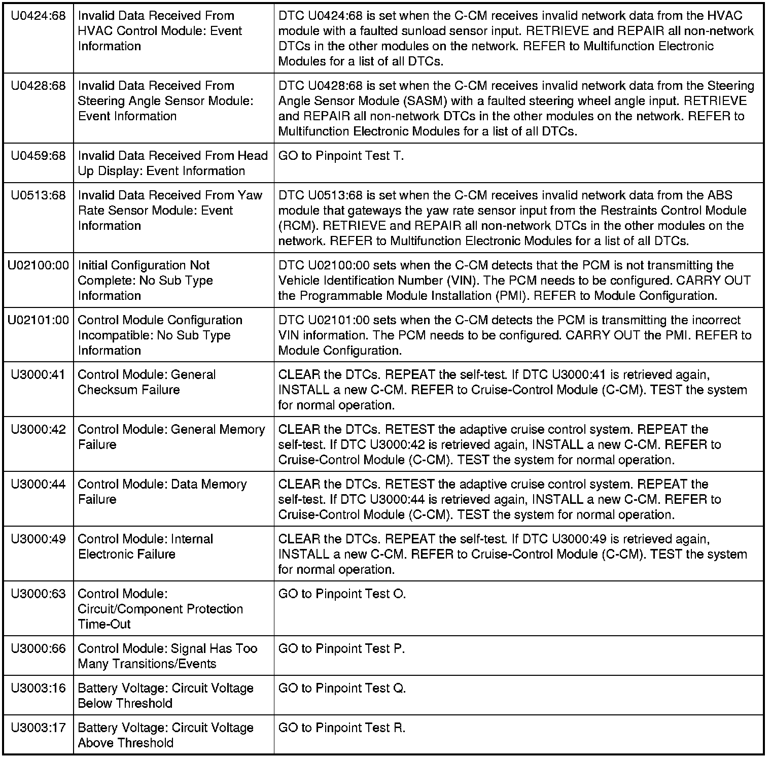NOTE: This module utilizes a 5-character DTC followed by a 2-character failure-type code. The failure-type code provides information about specific fault conditions such as opens, or shorts to ground. Continuous memory DTCs have an additional 2-character DTC status code suffix to assist in determining DTC history.