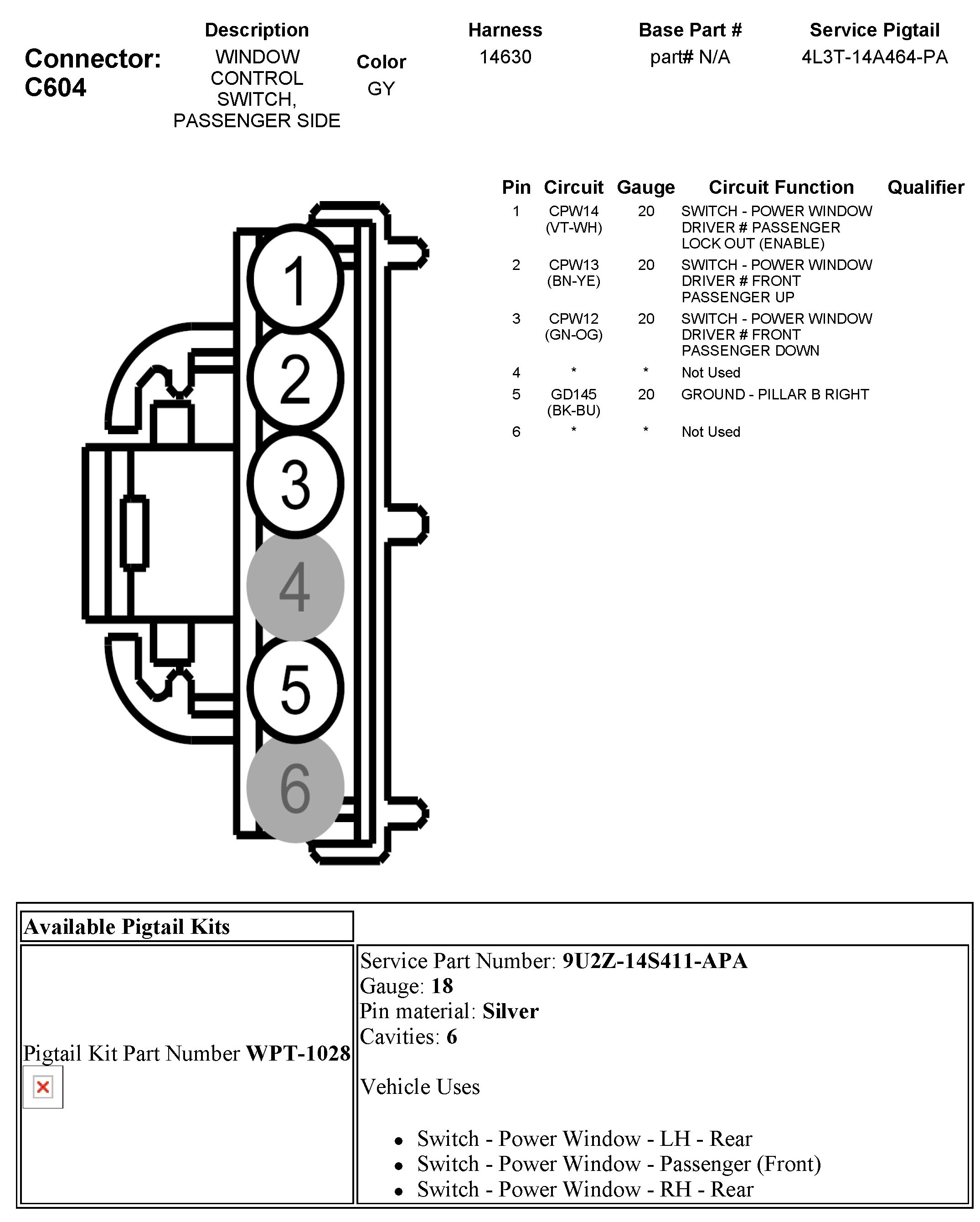 C604 Window Control Switch, Passenger Side