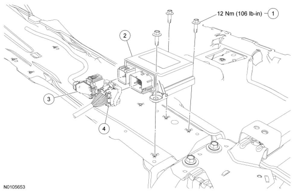1. WARNING: Always tighten the fasteners of the restraints control module (RCM) and impact sensor (if equipped) to the specified torque. Failure to do so may result in incorrect restraint system operation, which increases the risk of personal injury or death in a crash.