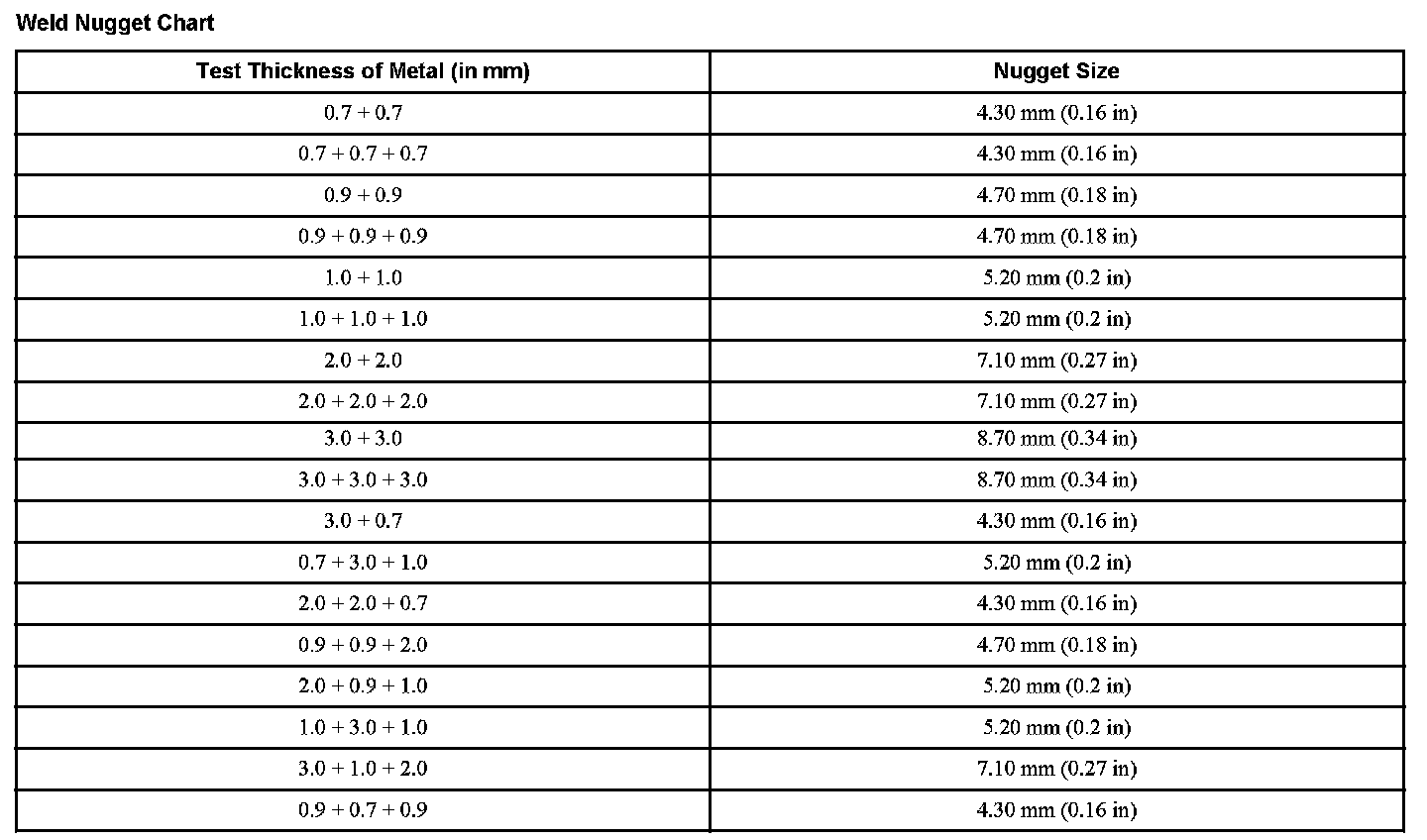 Weld Nugget Chart: