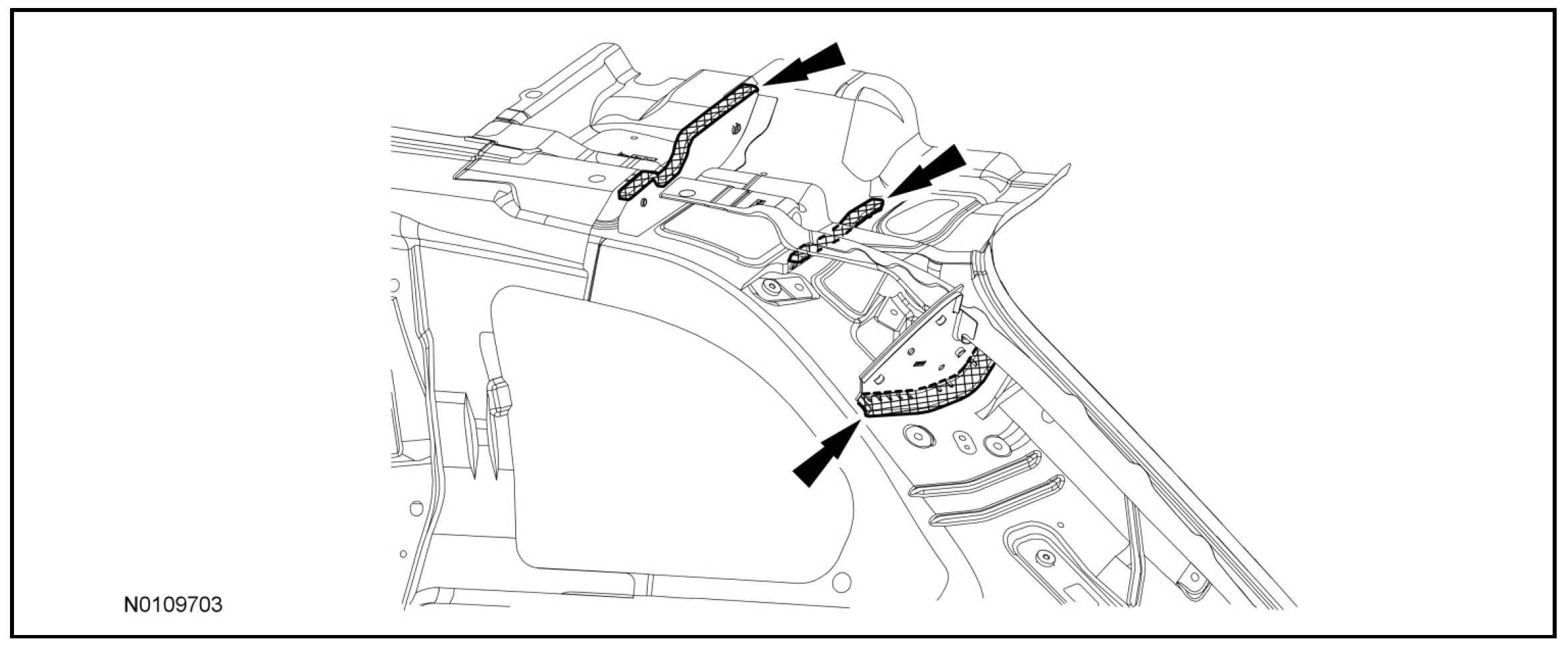 5. Apply metal bonding adhesive to the baffle flange as indicated, build a bead 7 mm (0.275 in) to 9 mm (0.354 in) thick, to create full contact with the body side assembly. Install the liftgate header brackets and apply metal bonding adhesive to the header brackets.
