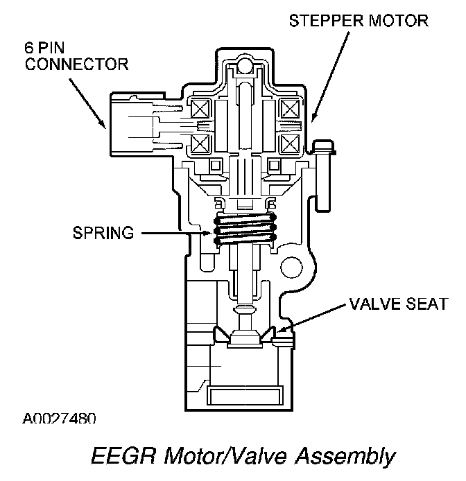 Depending on the application, the EEGR valve is either a water cooled or an air cooled motor/valve assembly. The motor is commanded to move in 52 discrete steps as it acts directly on the EEGR valve. The position of the valve determines the rate of EGR. The built-in spring works to close the valve against the motor opening force.