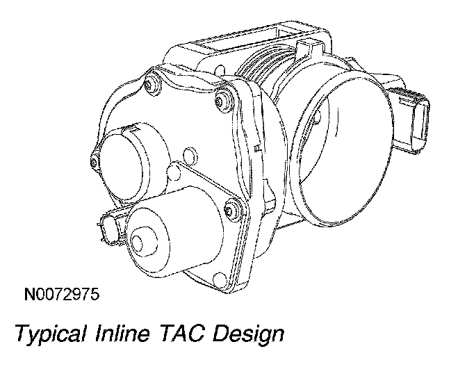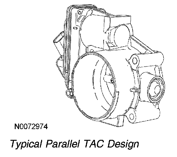 The electronic TAC is a DC motor controlled by the PCM. There are 2 designs for the TAC, parallel and inline. The parallel design has the motor under the bore parallel to the plate shaft. The motor housing is integrated into the main housing. The inline design has a separate motor housing. Both designs use an internal spring to return the throttle plate to a default position. The default position is typically a throttle angle of 7 to 8 degrees from the hard stop angle. The closed throttle plate hard stop prevents the throttle from binding in the bore. This hard stop setting is not adjustable and is set to result in less airflow than the minimum engine airflow required at idle. For additional information, refer to Torque Based Electronic Throttle Control (ETC).
