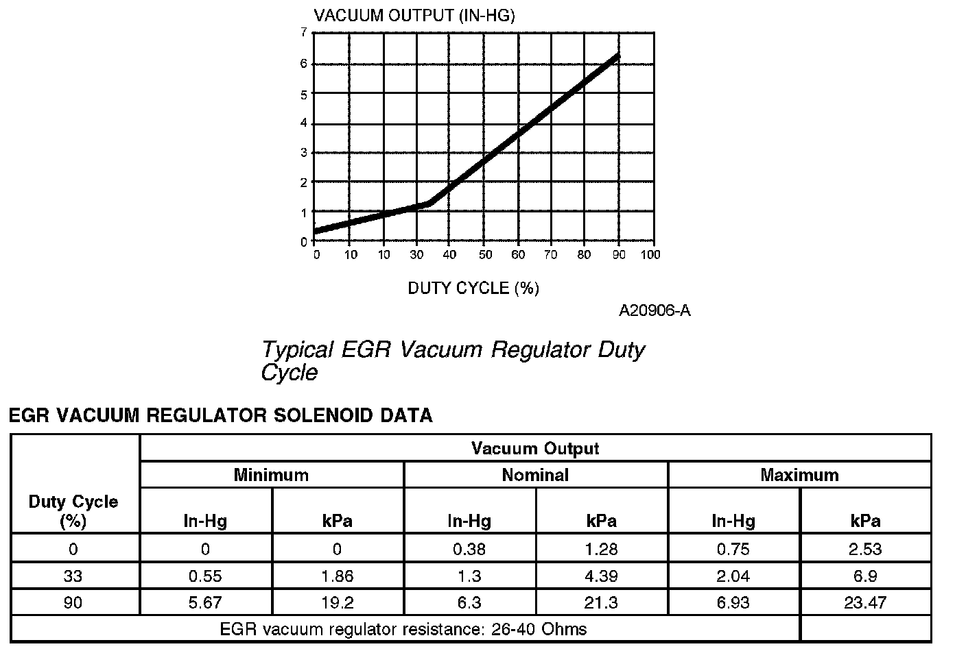 The EGR vacuum regulator solenoid is an electromagnetic device used to regulate the vacuum supply to the EGR valve. The solenoid contains a coil which magnetically controls the position of a disc to regulate the vacuum. As the duty cycle to the coil increases, the vacuum signal passed through the solenoid to the EGR valve also increases. Vacuum not directed to the EGR valve is vented through the solenoid vent to the atmosphere. At 0% duty cycle (no electrical signal applied), the EGR vacuum regulator solenoid allows some vacuum to pass, but not enough to open the EGR valve.