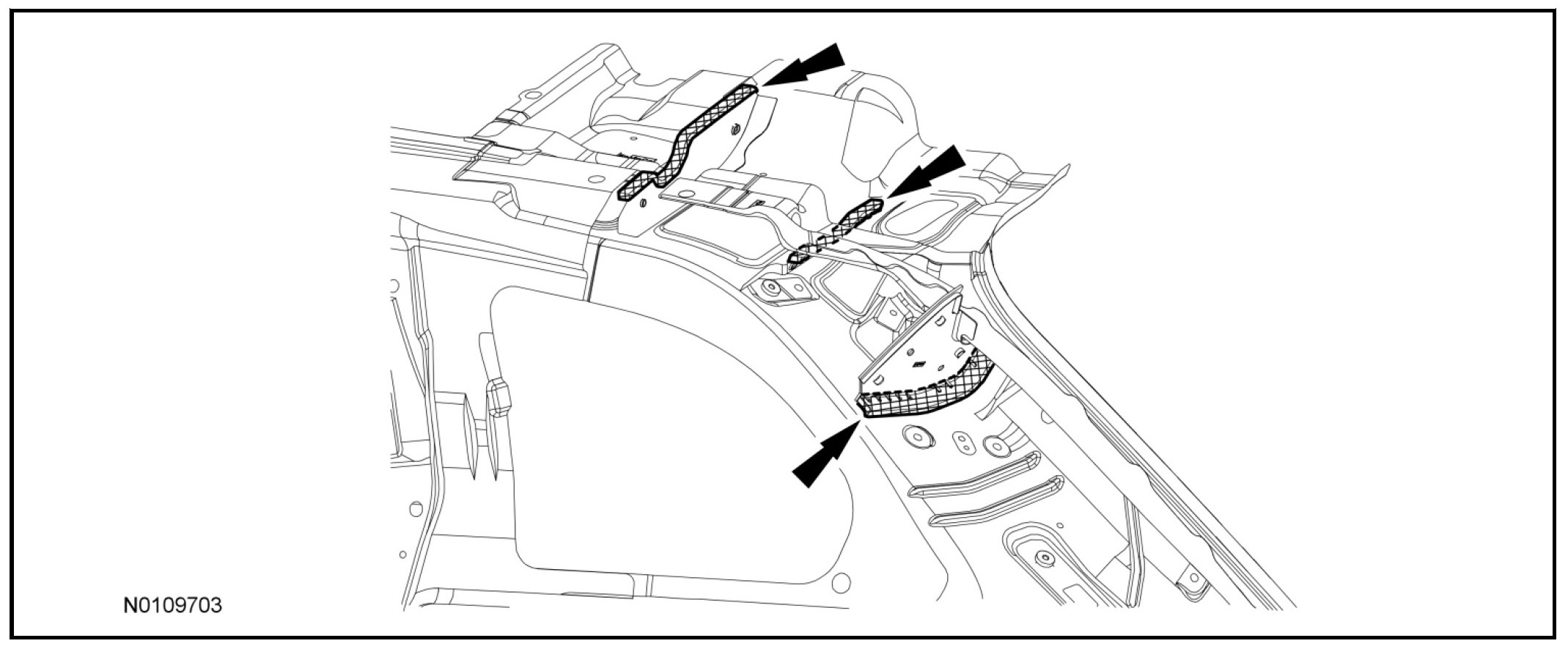 3. NOTICE: When servicing the upper D-pillar area, service kit part No. 4310B57 LH/4310B56 RH is required. This contains a baffle and 2 liftgate header brackets per side. The baffle provides structural rigidity to this area. Failure to follow these steps will compromise structural integrity and NVH properties of the vehicle.