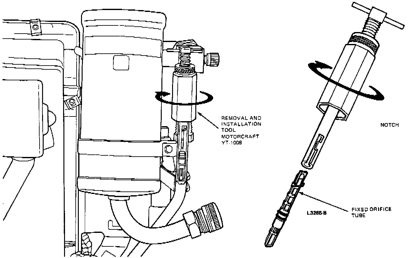 6. If the fixed orifice tube breaks in the evaporator core tube, it must be removed from the tube with an extractor, Motorcraft Tool YT-1009 or equivalent.