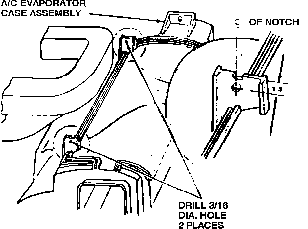 8. Drill a (3/16 inch) hole in both upright tabs on top of evaporator case, Fig. 13.