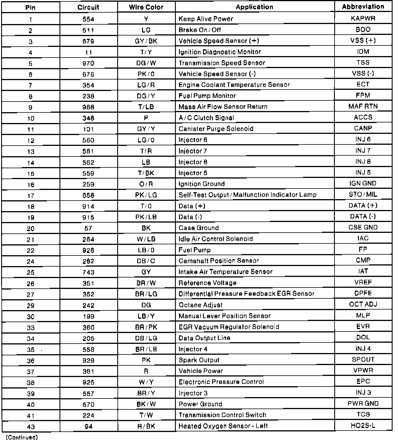 Powertrain Control Module (PCM) Connector Pin Usage: