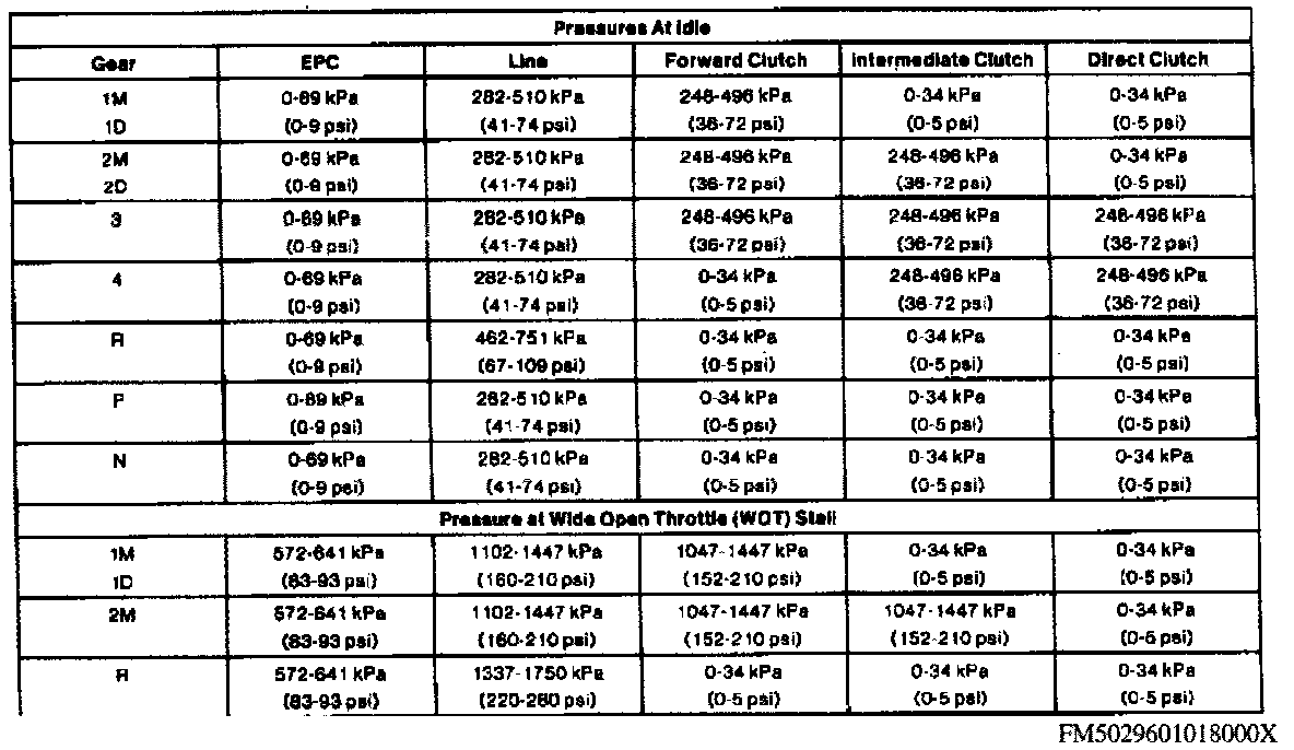 LINE PRESSURE TESTCAUTION: Perform the line pressure test prior to the stall speed test. If line pressure is low at stall, do not perform stall speed test, as transmission damage will occur. Do not allow engine to run at Wide Open Throttle (WOT) for more than 5 seconds.