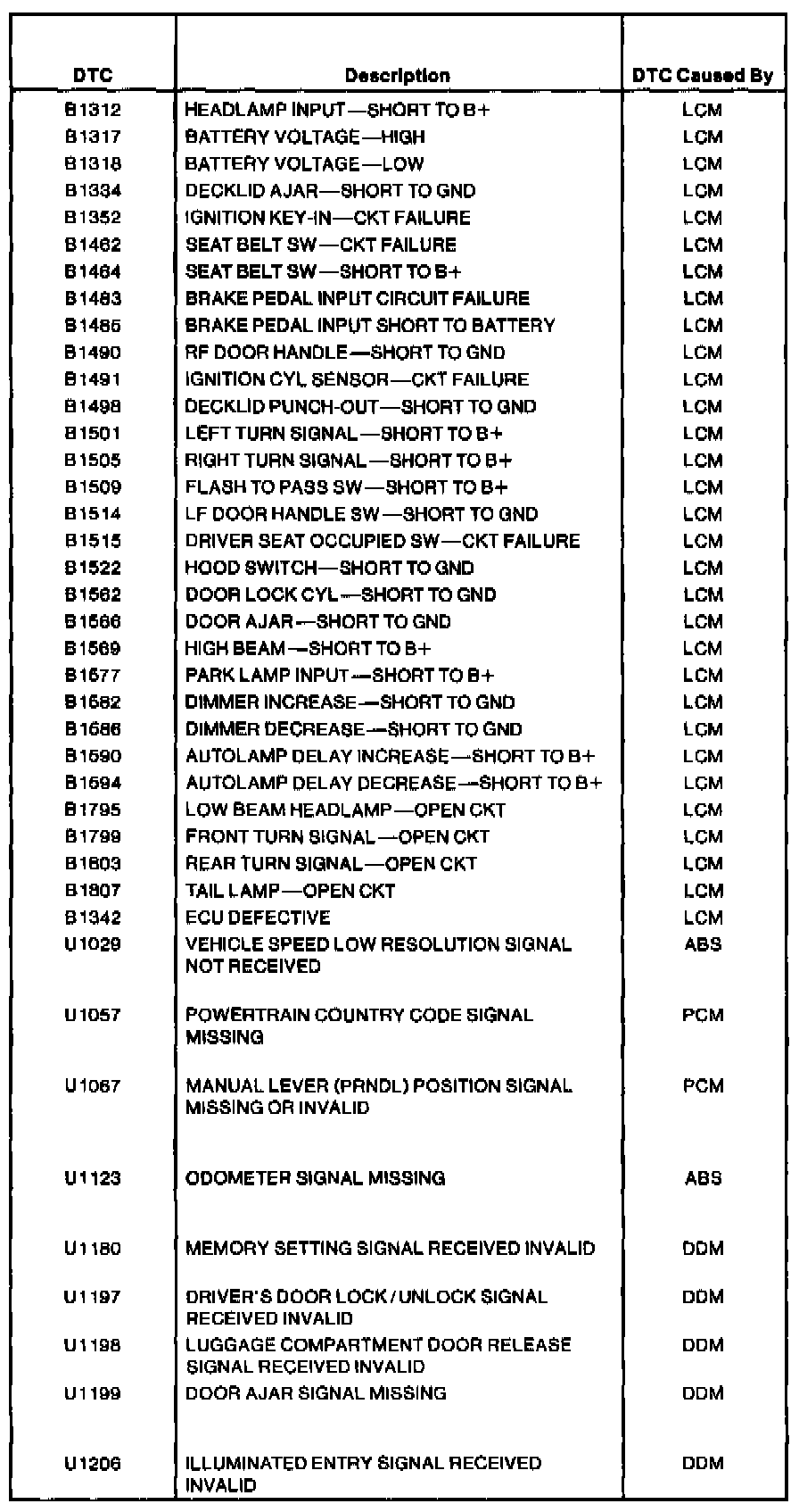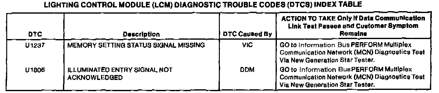 Lighting Control Module Diagnostic Trouble Code (DTC) Index