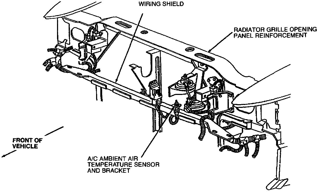 4. Remove A/C ambient air temperature sensor and bracket from its mounting location on the wiring shield in front of the A/C condenser core.