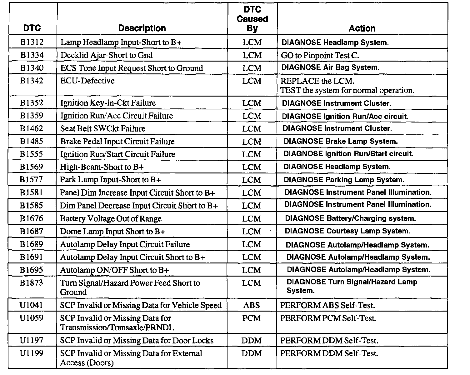 Lighting Control Module Diagnostic Trouble Code (DTC) Index