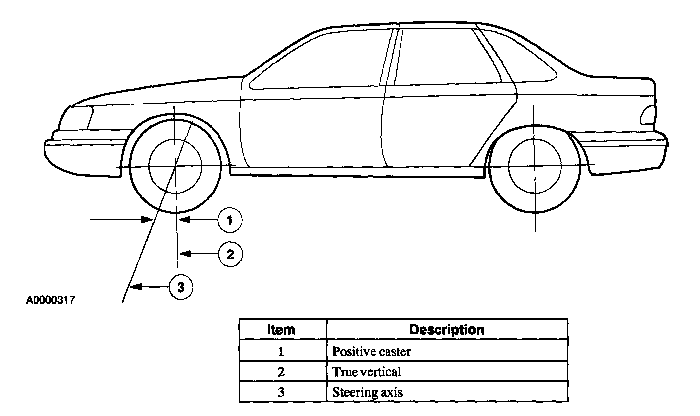 Caster is the deviation from vertical of an imaginary line drawn through the ball joints when viewed from the side. The caster specifications in this section will give the vehicle the best directional stability characteristics when loaded and driven. The caster setting is not related to tire wear.