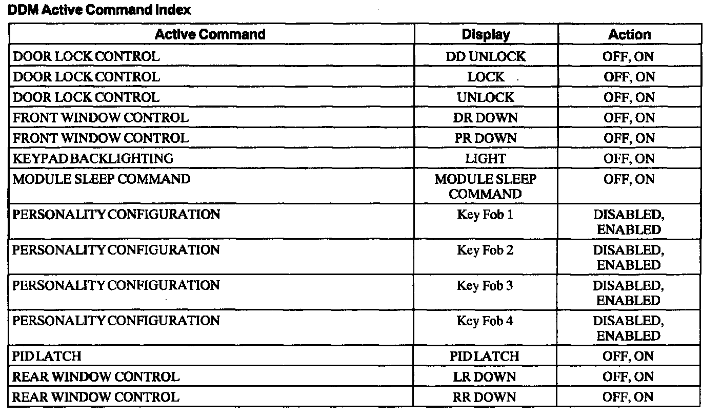 Driver Door Module (DDM) Active Command Index