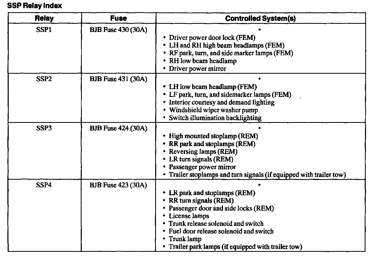When diagnosing an SSP relay, check that all Systems for that relay are inoperative Refer to Lighting and Horns if:
