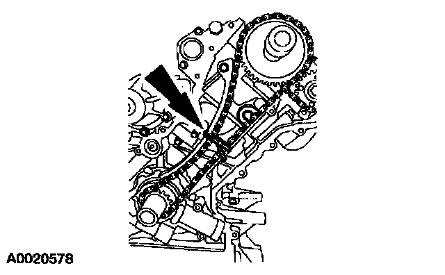 11. NOTE: If the timing mark on the LH timing chain crankshaft gear is facing toward the rear of the engine, install the RH timing chain crankshaft gear with the mark facing forward. If the timing mark on the LH timing chain crankshaft gear is facing toward the front of the engine, install the RH timing chain crankshaft gear with the mark facing toward the rear of the engine.