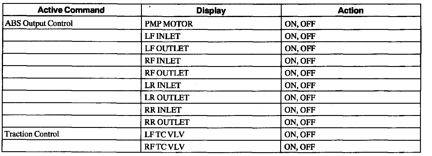 Anti-Lock Brake Control Module Active Command IndexNOTE: When pump motor or values are turned on, the display on scan tool remains until the scan tool operator switches states, but the motor and valves are turned on for only approximately three seconds to avoid overheating.