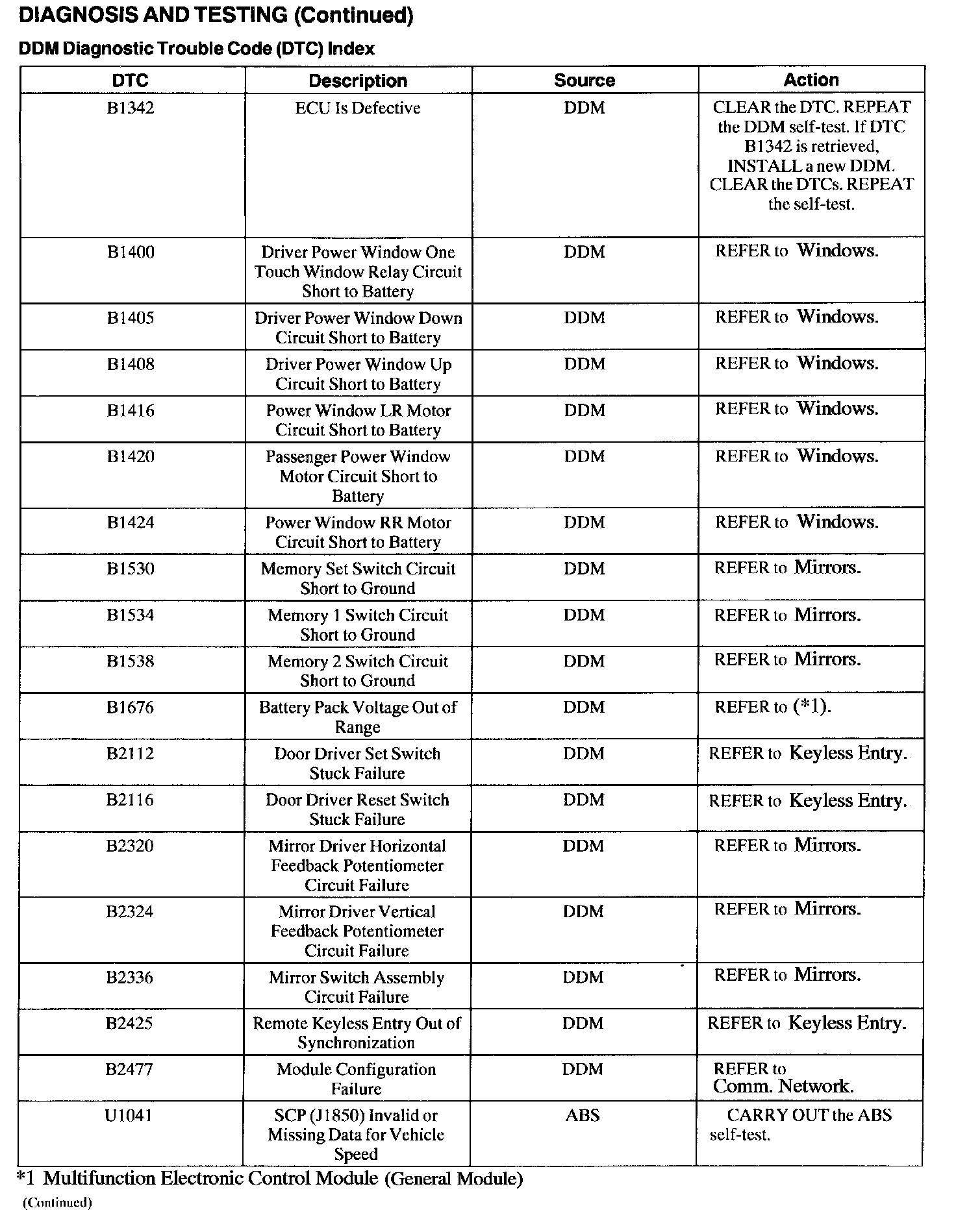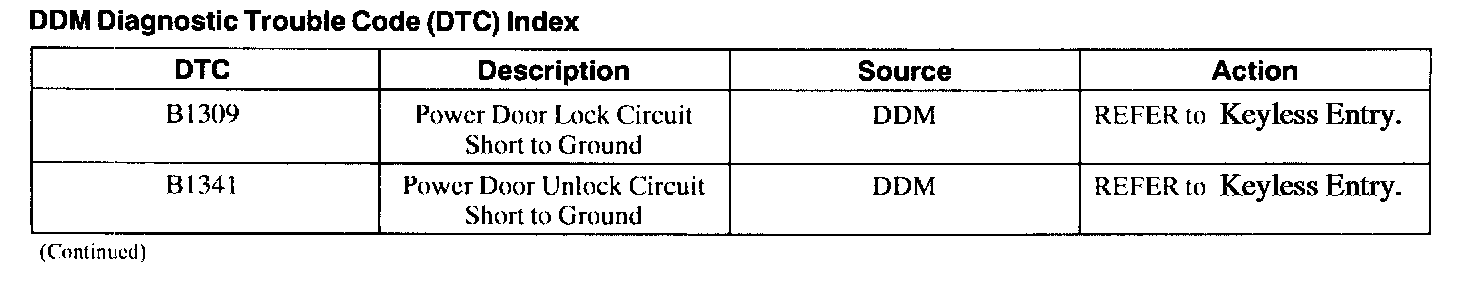 Driver Door Module (DDM) Diagnostic Trouble Code (DTC) Index