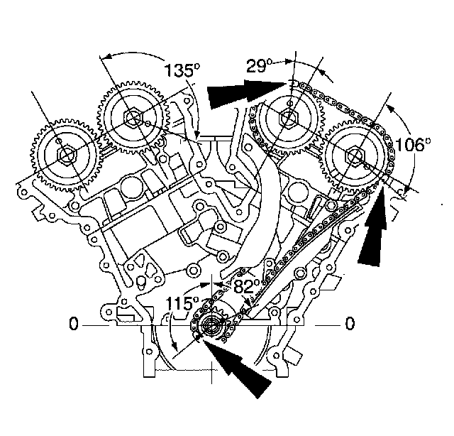 Verify that the timing index links (gold color) on the LH timing chain are in alignment with the timing index marks on the camshaft and crankshaft sprockets.