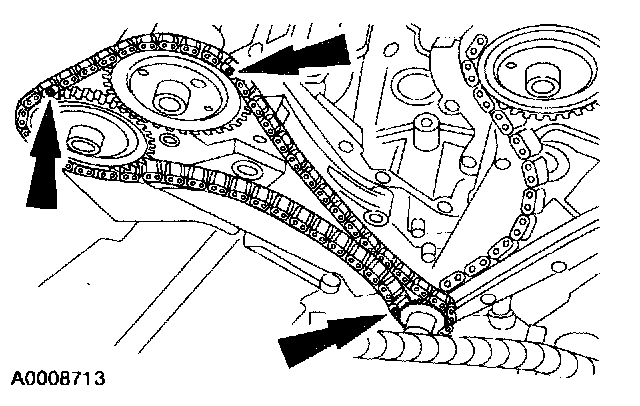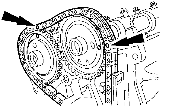 Verify that the timing index links (gold color) on the RH timing chain are in alignment with the timing index marks on the camshaft and crankshaft sprockets.