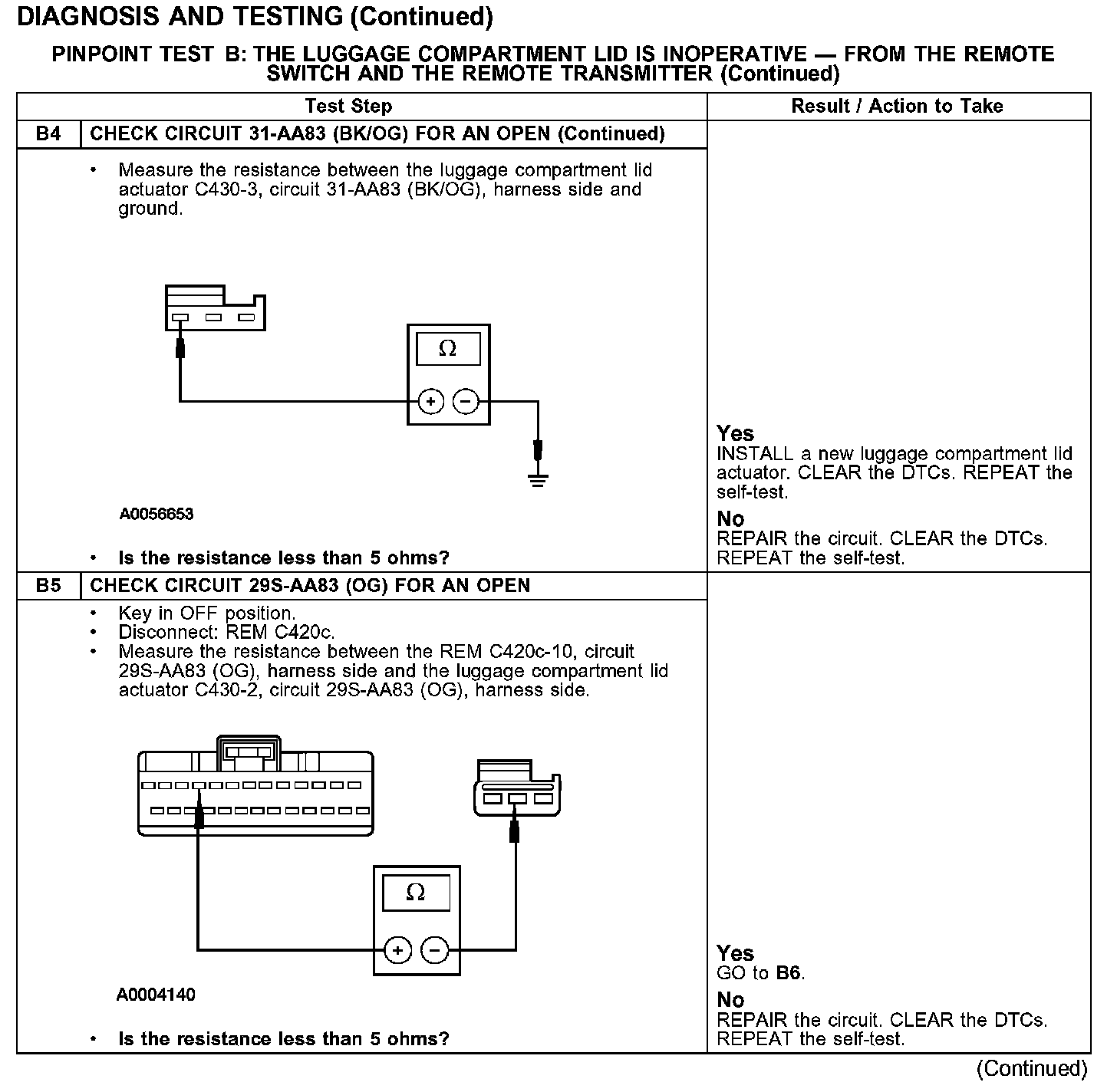 PINPOINT TEST B: THE LUGGAGE COMPARTMENT LID IS INOPERATIVE - FROM THE REMOTE SWITCH AND THE REMOTE TRANSMITTERTest B1-B4: