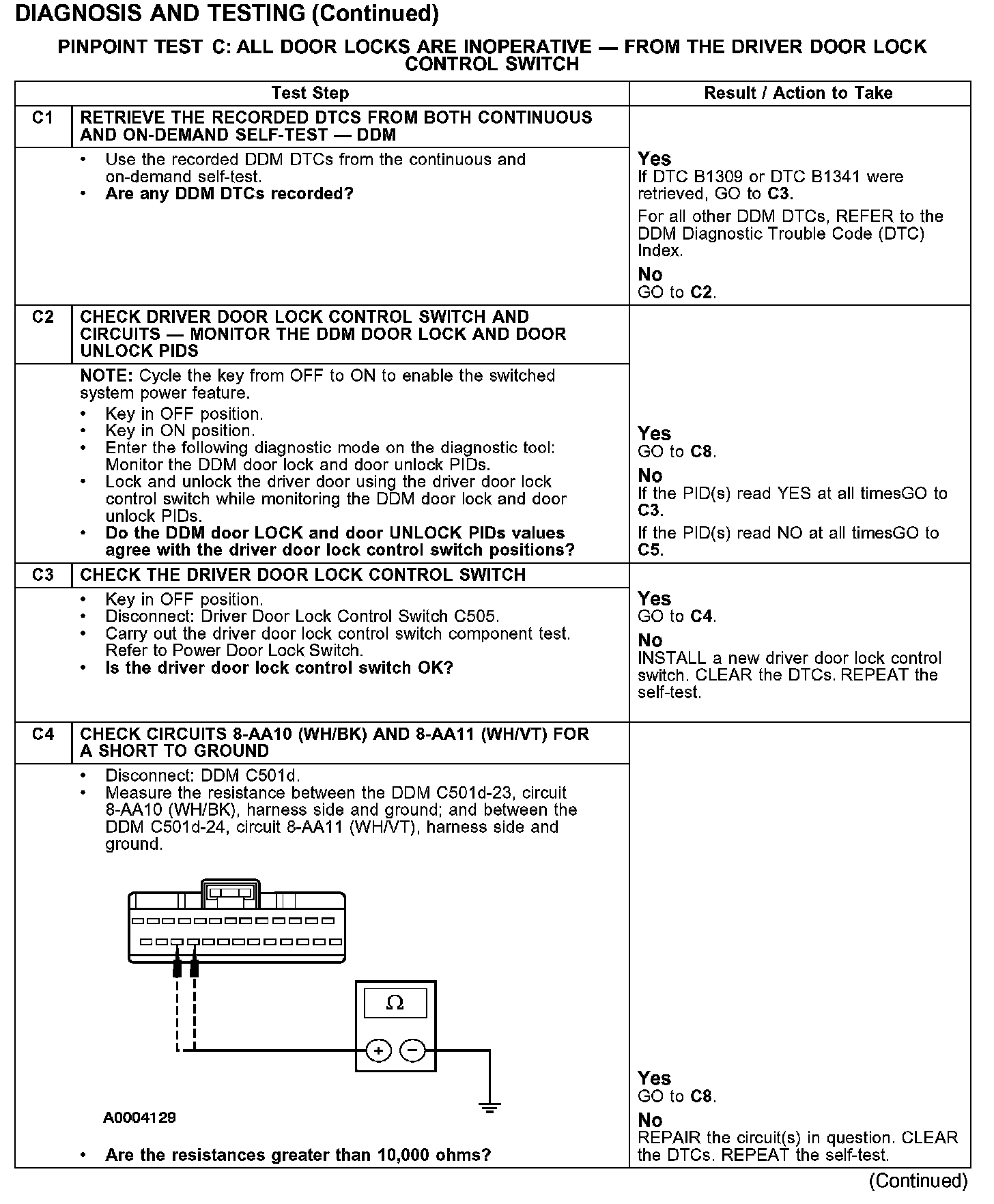 PINPOINT TEST C: ALL DOOR LOCKS ARE INOPERATIVE - FROM THE DRIVER DOOR LOCK CONTROL SWITCHTest C1-C4: