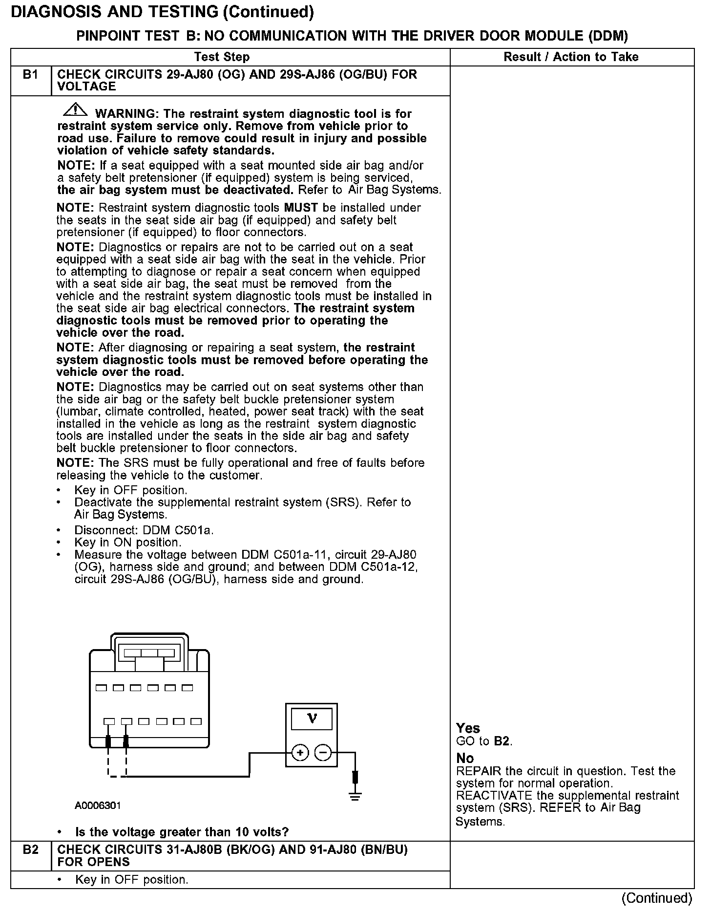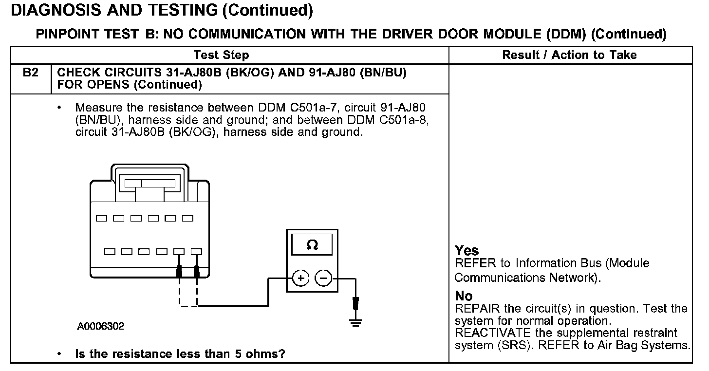PINPOINT TEST B: NO COMMUNICATION WITH THE DRIVER DOOR MODULE (DDM)Test B1-B2: