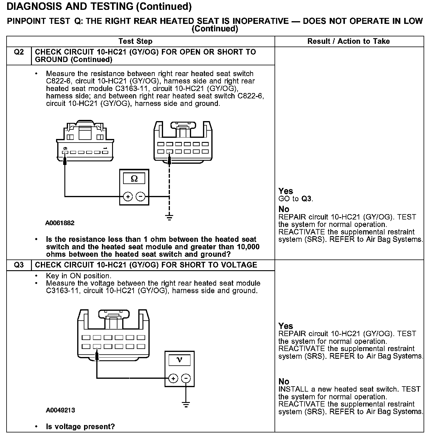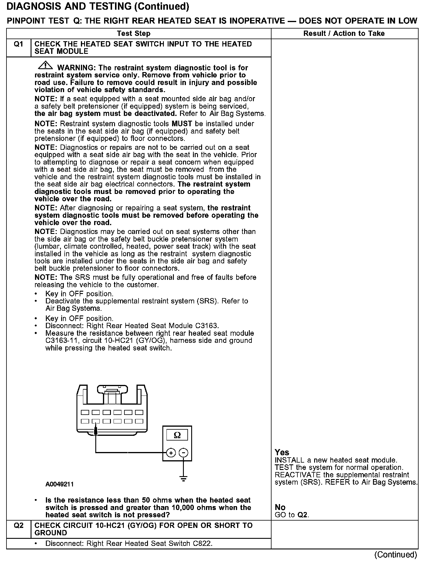 PINPOINT TEST Q: THE RIGHT REAR HEATED SEAT IS INOPERATIVE - DOES NOT OPERATE IN LOWTest Q1-Q2: